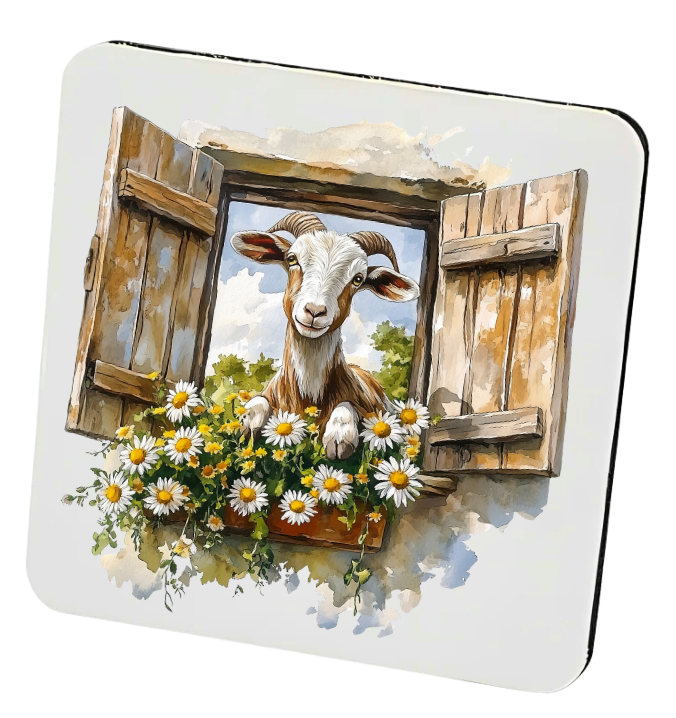 Bescherm je tafel in stijl met deze vrolijke set van vier onderzetters van een nieuwsgierige koe, een trotse haan, een wollig schaap en een eigenwijze geit.
