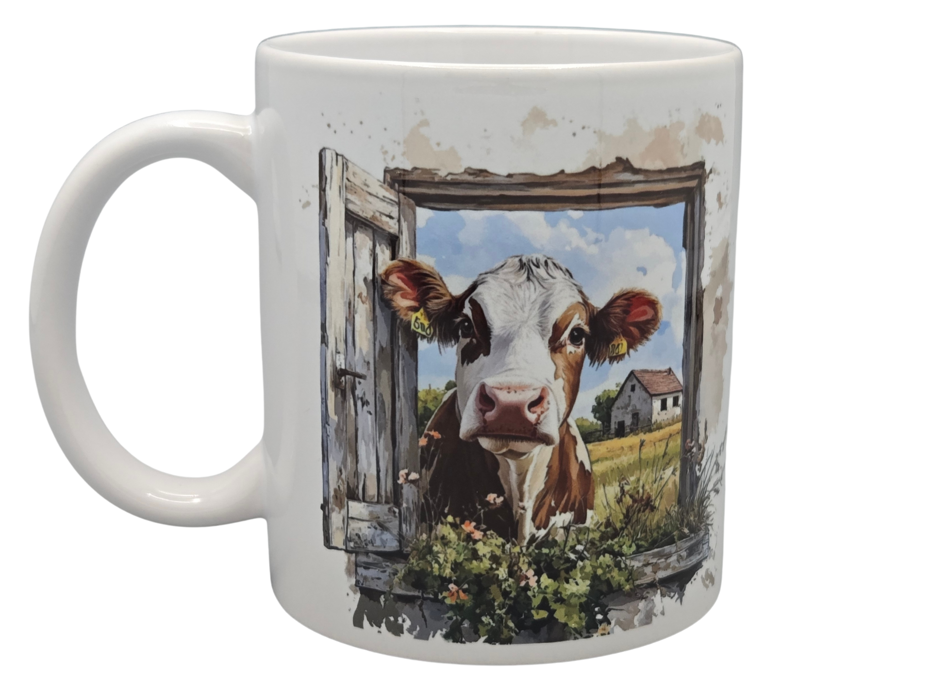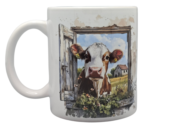 Een nieuwsgierige koe loeit je vrolijk toe. Een prachtige illustratie van een koe die nieuwsgierig door het raam kijkt. Perfect om je koffie, thee of melk uit te drinken.